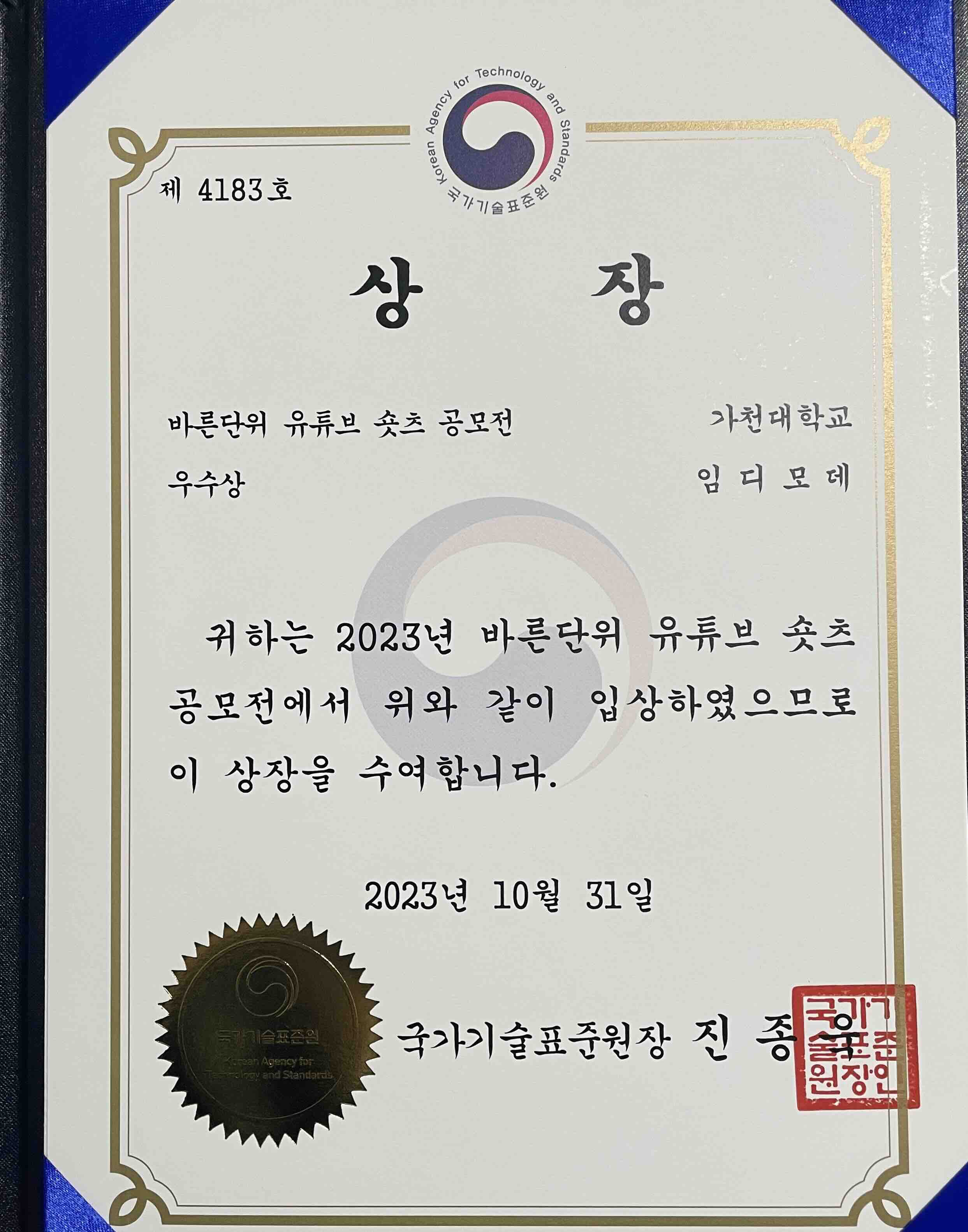 국가기술표준원 2023 바른단위 유튜브 숏츠 공모전 출품 영상 기획, 구성, 편집 (1인 제작). 내용 리서치 후 대본 작성, 자료 수집, 효과 편집 등. 공모전 우수상 수상.